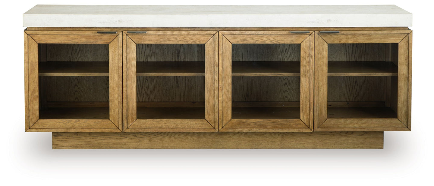 Curate a home that captures your knack for dynamic design. Merging the look of oak with faux concrete, this accent cabinet casts a decidedly contemporary vibe in your living space, dining area or entryway. Soft-close doors with glass inserts and two adjustable shelves give the piece a layer of fabulous function.