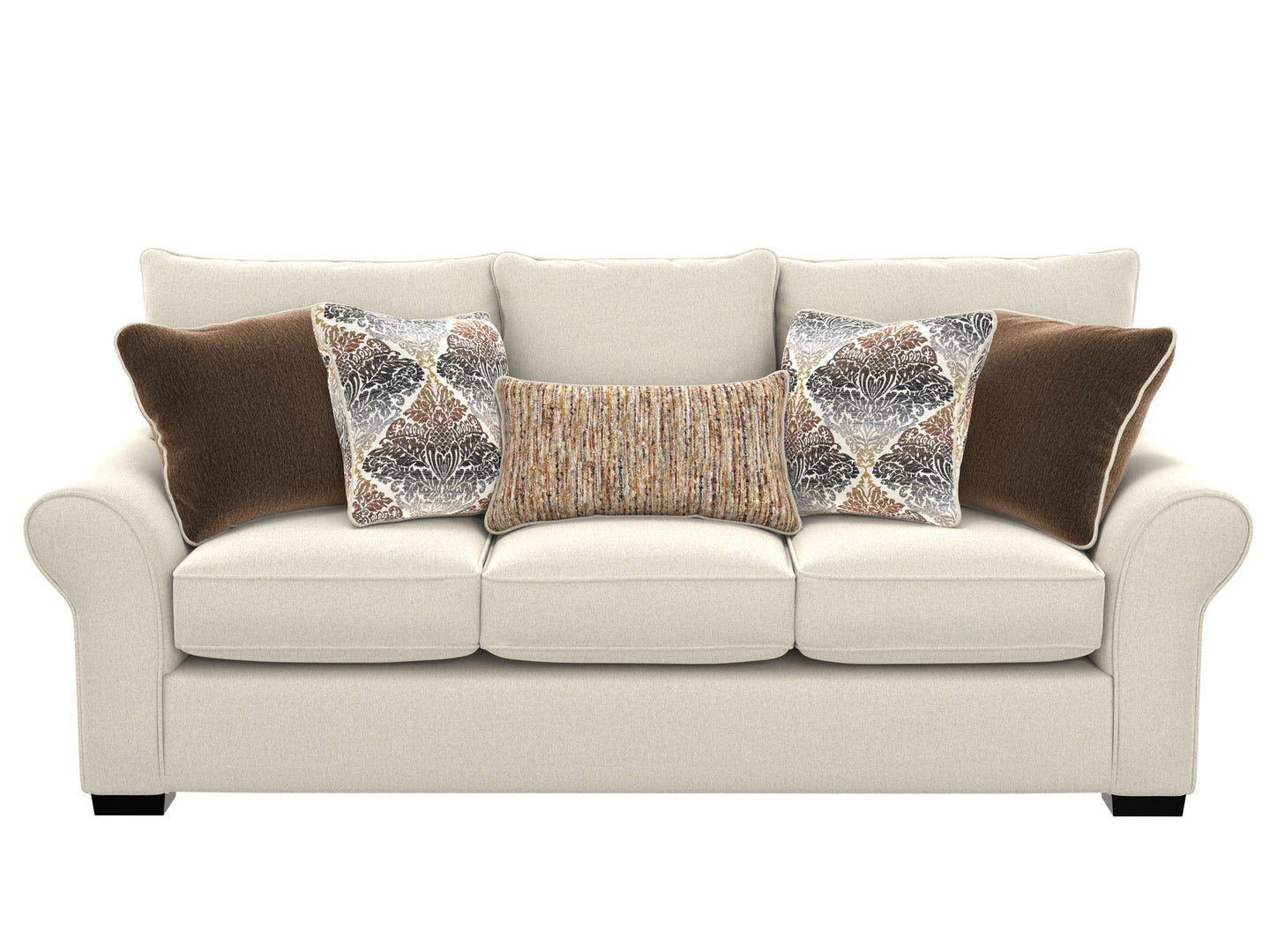 Alden features a transitional sock arm design and wooden pyramid legs. A variety of accent pillows provide additional color and texture.