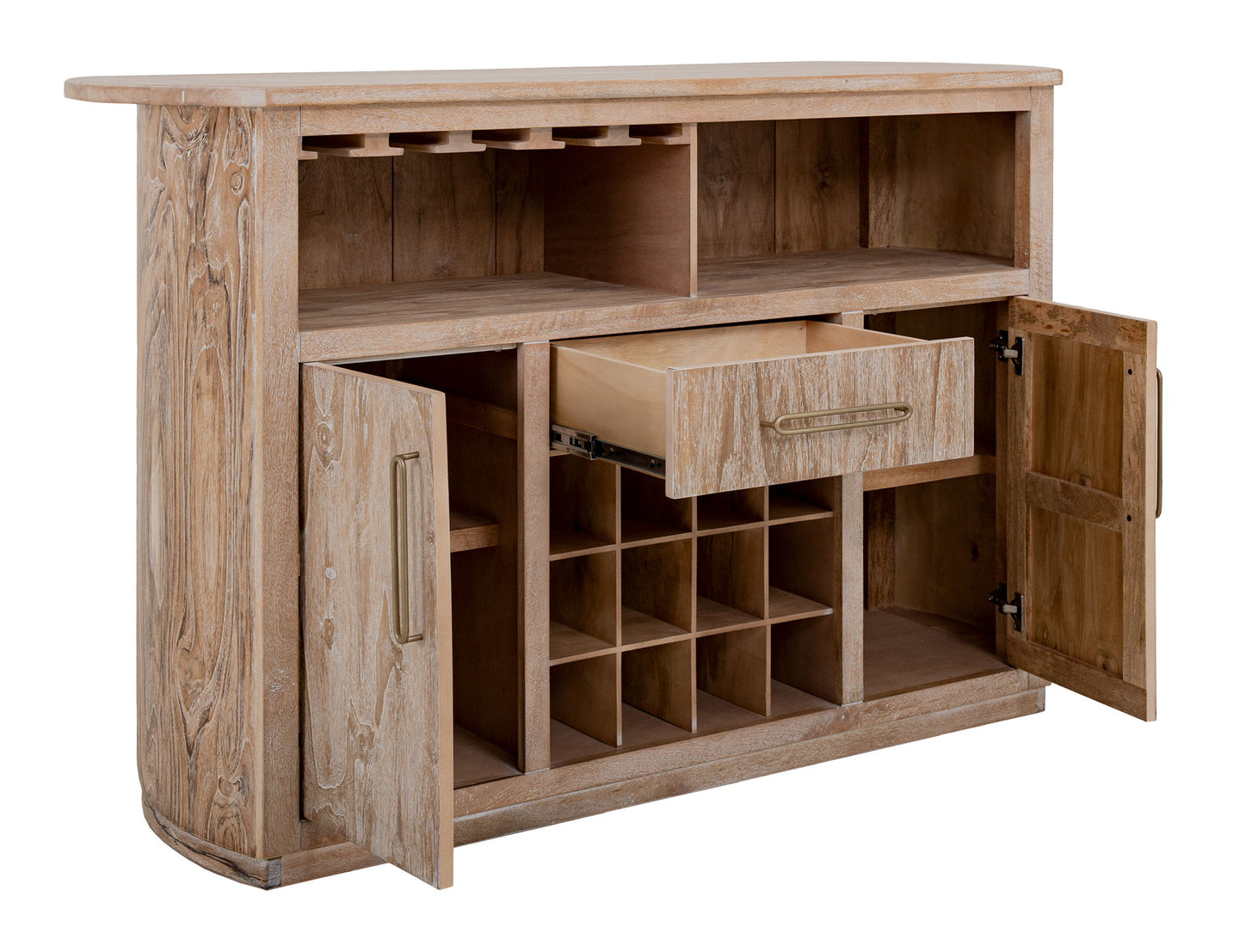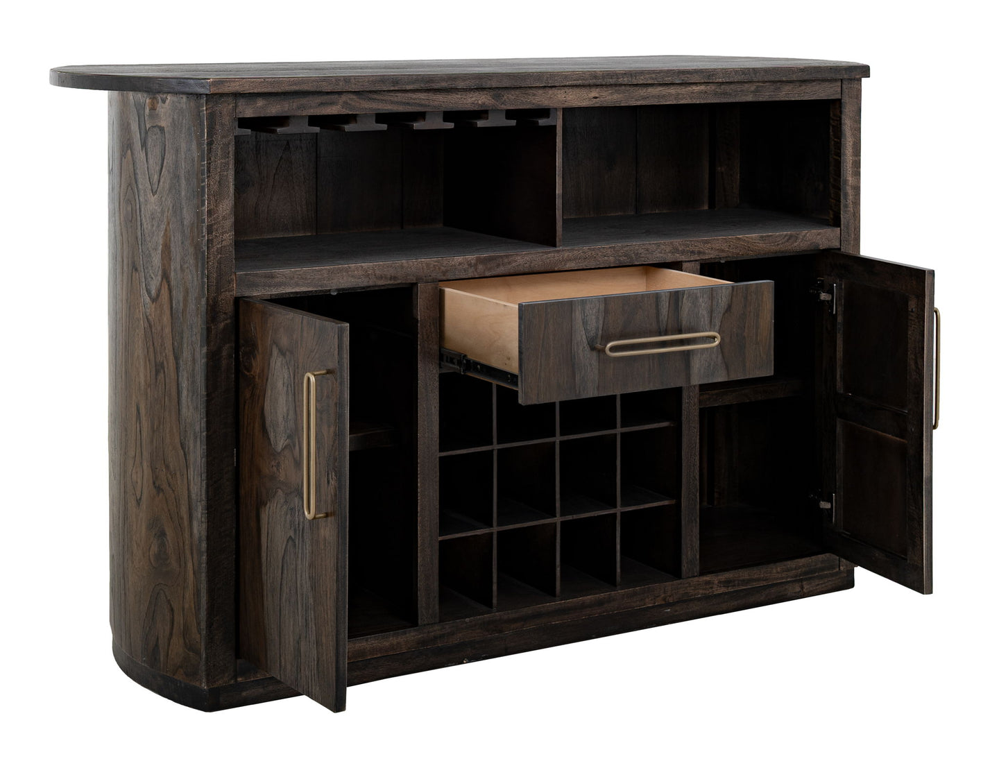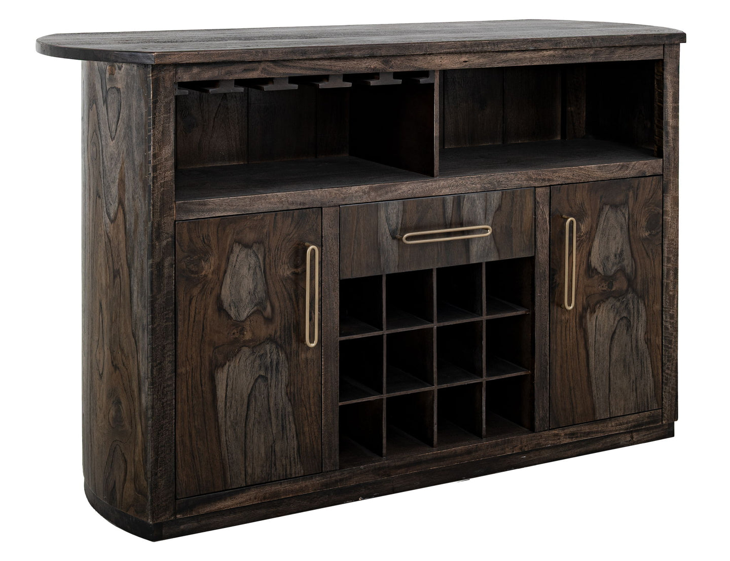 1-Drawer, 2-Door Bar with Wine Grid. Transform your space with our Balam mango and teak wood bar, crafted to blend wood's warmth and beauty with timeless elegance. Its rich wood grain and meticulous finishing make it a captivating focal point. Ideal for hosting gatherings or creating a stylish cocktail corner, our bar offers both functionality and style. Featuring ample storage, a spacious countertop, and a seamless blend of classic and contemporary design, it's the perfect addition to a welcoming, sophisticated gathering spot.