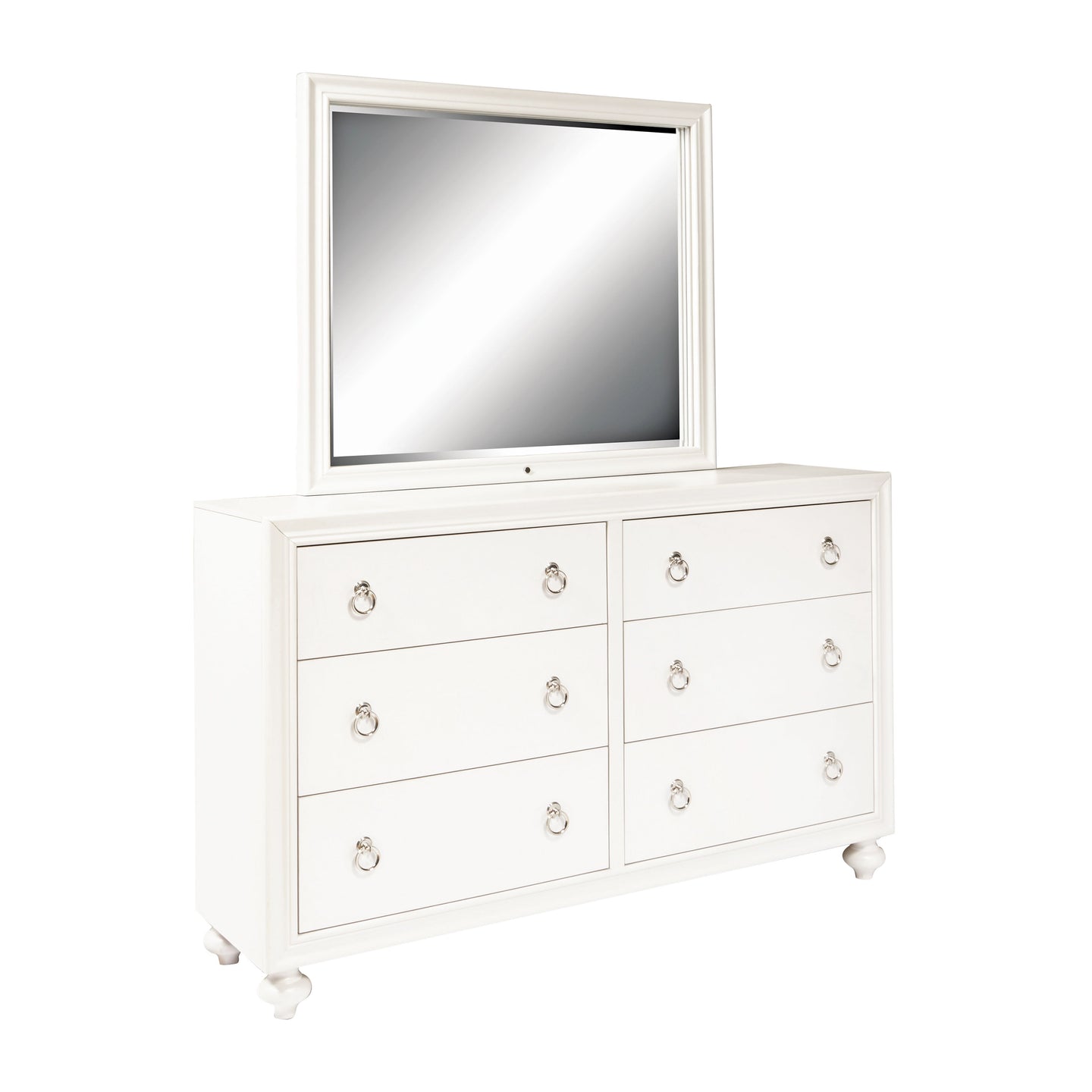 From the smooth white top to the elegant bun feet underneath, this kids dresser is an elegant dream for their bedroom decor. Well-scaled silver ring pulls give each of the six generously-sized drawers a regal look. The clean modern lines of the case make this design both timeless and appealing, ideal for keeping clothes, linens, and personal belongings neat and tidy. Pair with the matching lighted dresser mirror, sold separately, for a cohesive look in a crisp white finish.