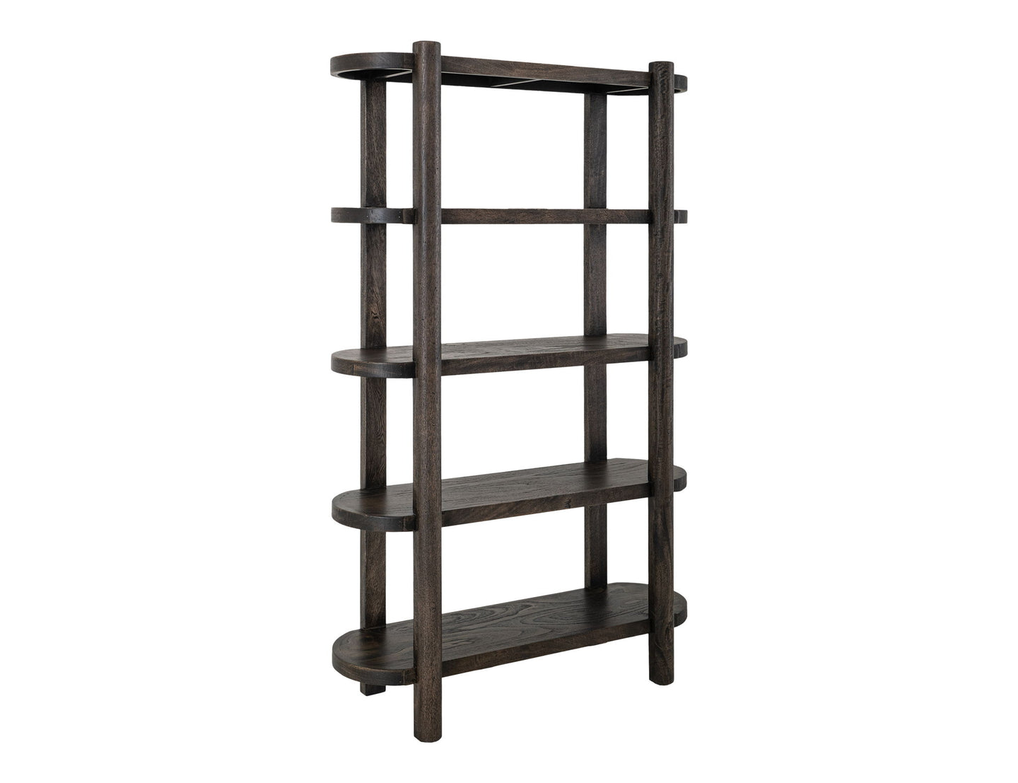 4 Shelves, Bookcase. Our exquisite Black Balam collection is meticulously handcrafted using high-quality mango and teak wood. This simple yet striking collection is designed to infuse your space with an organic, modern aesthetic. The bookcase boasts a unique organic shape, featuring elegantly curved oval shelves and rounded legs, adding a touch of sophistication to any room.