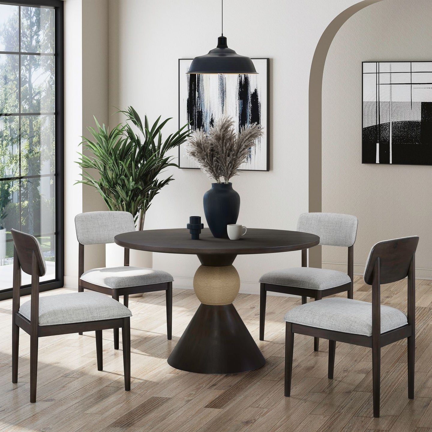 Shaped to charm, styled to stay, the Briarcrest casual dining is ideal for small spaces with a modern aesthetic. Featuring a soft chamfered top edge and a decorative bobbin base wrapped in Danish cord with a visually dramatic flare to the floor.