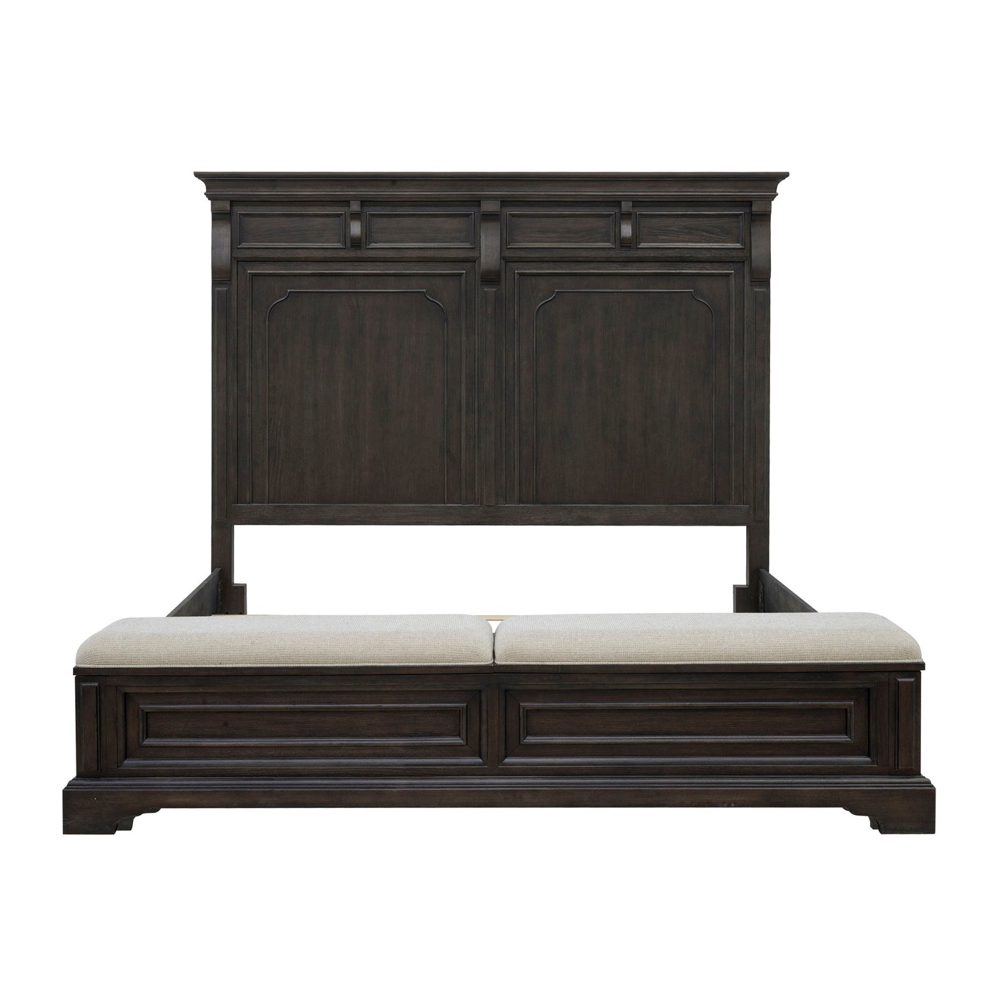 Discover the perfect blend of strength and sophistication with our Hickory Creek Storage Bed. It showcases a stately mantel-style headboard in a luxurious Velvet finish with a distinctive vertical break, adding architectural depth and refined elegance. The footboard has built-in storage compartments with upholstered hinged tops, perfect for storing bedding, clothes, and other essentials. Crafted from split heart cathedral hickory veneers, the rich grain patterns and natural variation bring visual interest and heritage appeal to every detail. This bed embodies classic English style, craftsmanship, and masculine charm, making it perfect for those who appreciate timeless design.