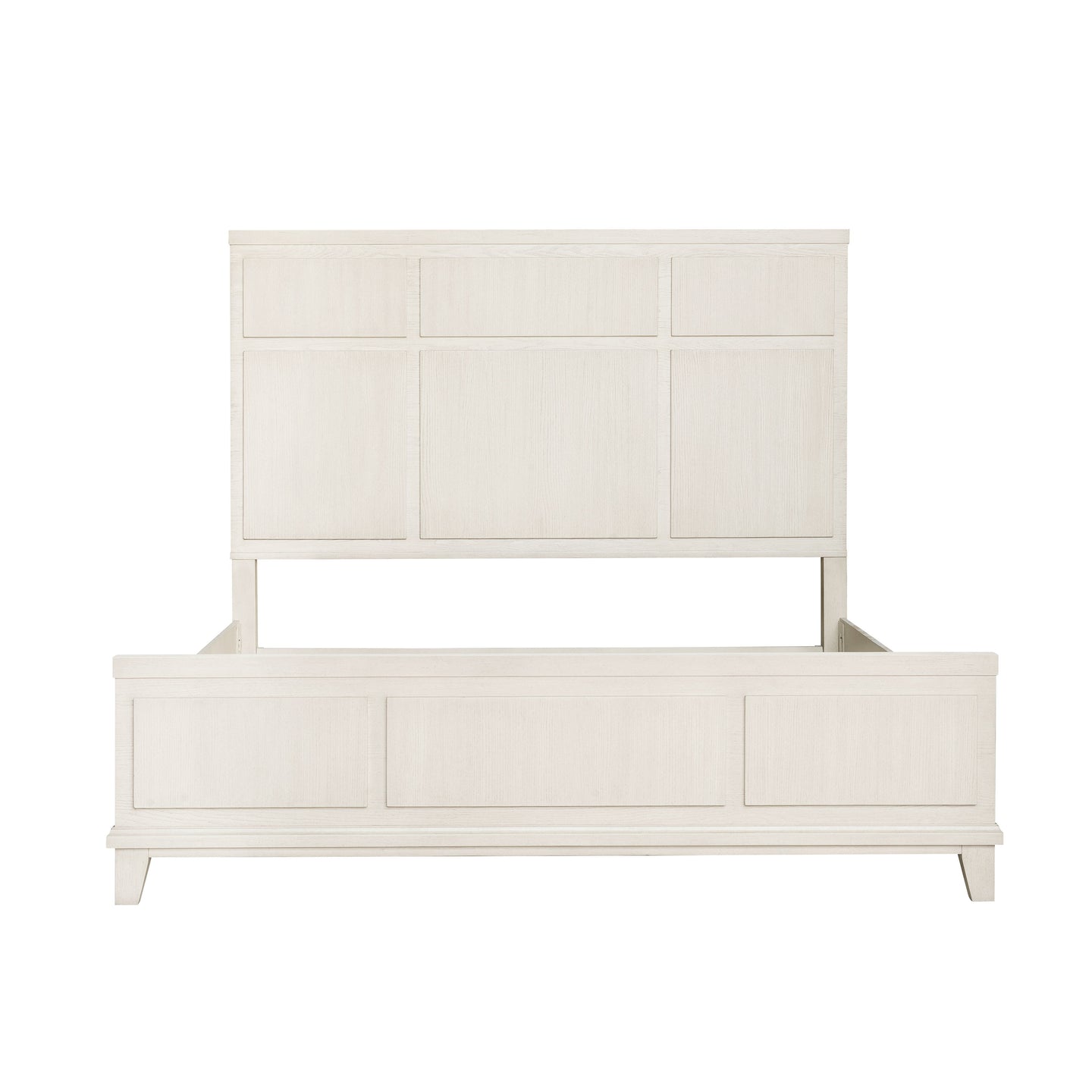 Clean, chic and casual with a serene natural white finish that highlights the character of the Quartered Ashe Wood Veneer construction, the Madison Panel Bed is a stylish centerpiece for any bedroom space. The headboard and footboard of the bed feature a panel overlay design for added dimension and depth. Shaped splay feet elevate the bed.