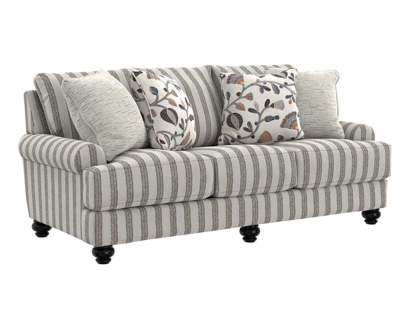 Marley features a Traditional 3-over-3 design sofa in a decorative striped polyester fabric. A correlating pillow package and turned wooden legs complete the look. Marley is available in one color: Mocha.