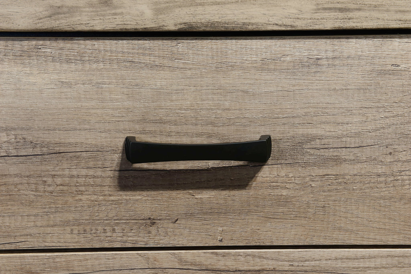 This modern bedroom collection features a clean-lined design with a stylish weathered gray finish. Sturdy and practical, each piece is equipped with ample storage and smooth metal hardware. The bed's bold headboard is a standout element, making it the focal point of the room. This set is perfect for anyone looking to add a touch of contemporary sophistication to their bedroom without sacrificing functionality.