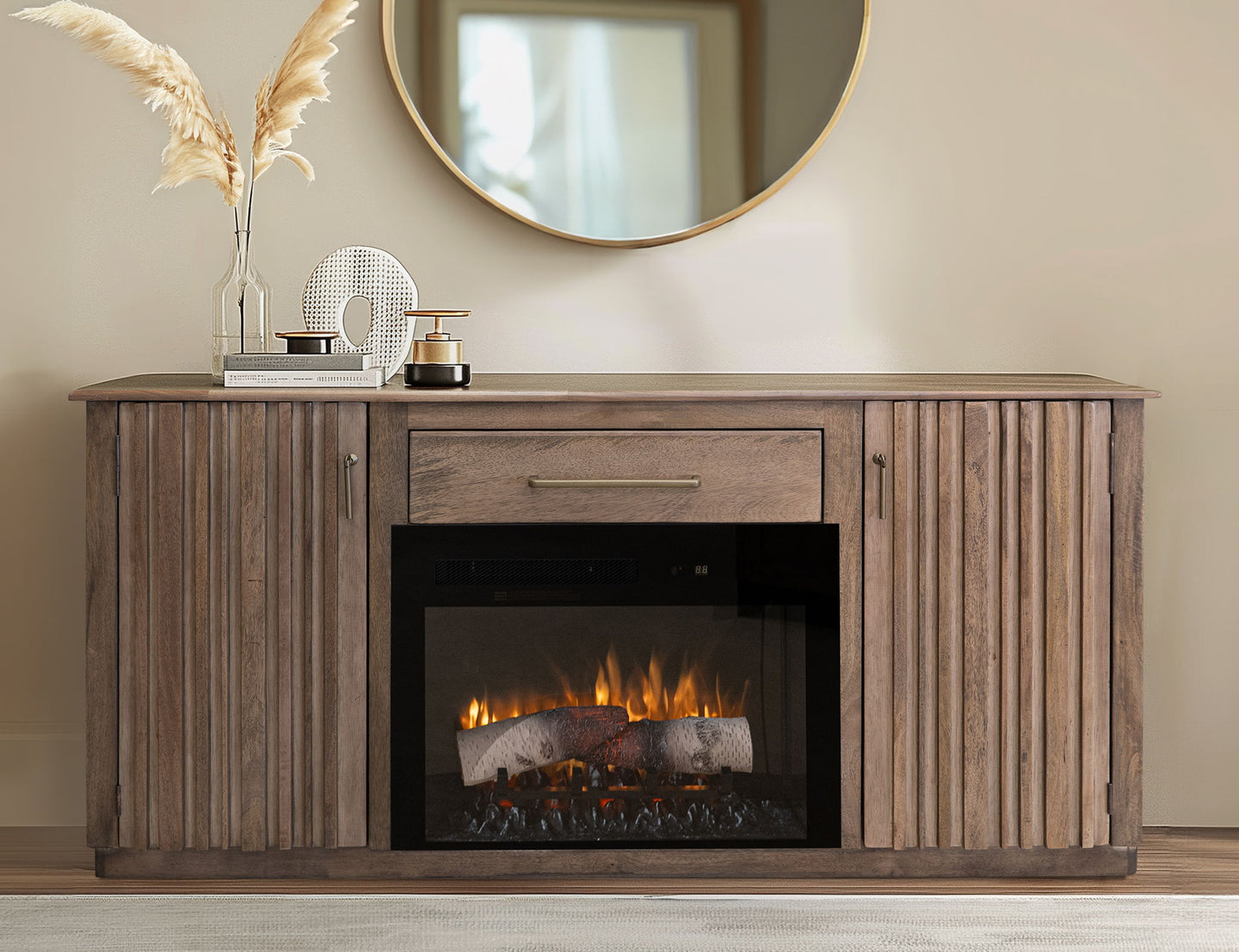 1 Drawer, 2 Doors Fireplace TV Stand 70". Introducing The Mezquite Collection: This exquisite collection is meticulously handcrafted from sustainable mango wood. Its light distressed finish gracefully accentuates the natural richness of the wood grain, while its captivating and eclectic design elevates it to a true statement piece that can effortlessly enhance the ambiance of any room in your home.
