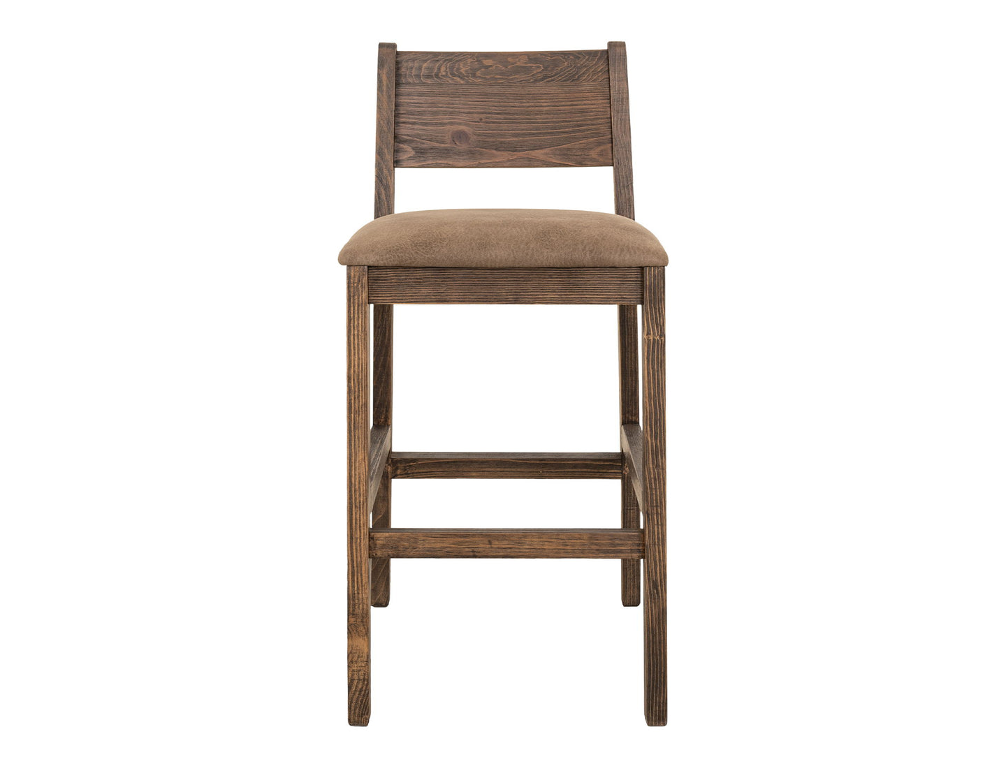 Upholstered Seat 30" Barstool. Novus Lodge is a revamped version of our bestseller, the Lodge collection. The simplicity of its shapes and warm color palette makes it a timeless collection. Novus Lodge showcases lightly distressed premium woods such as poplar and oak in a warm brown finish that enhances the beauty and character of the wood.
