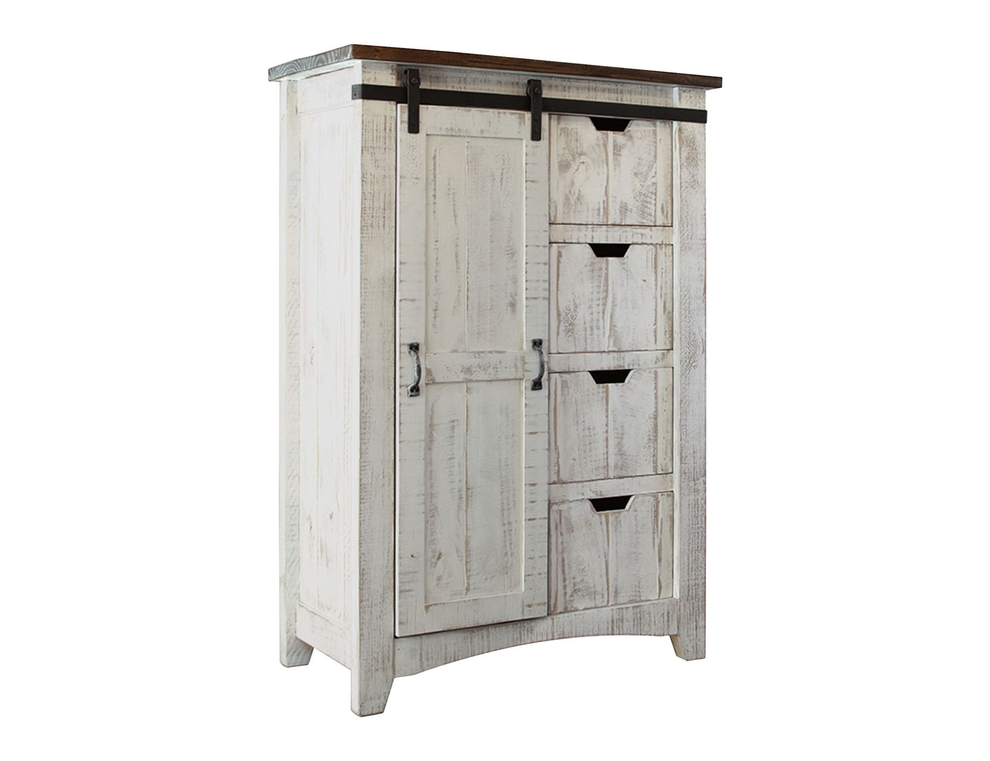 4 Drawer 1 Door Chest. Introducing our Pueblo collection, crafted from solid pine wood. This rustic collection is the perfect addition to bring your dream space to life. It features a hand-distressed finish in gray and brown on the tops.