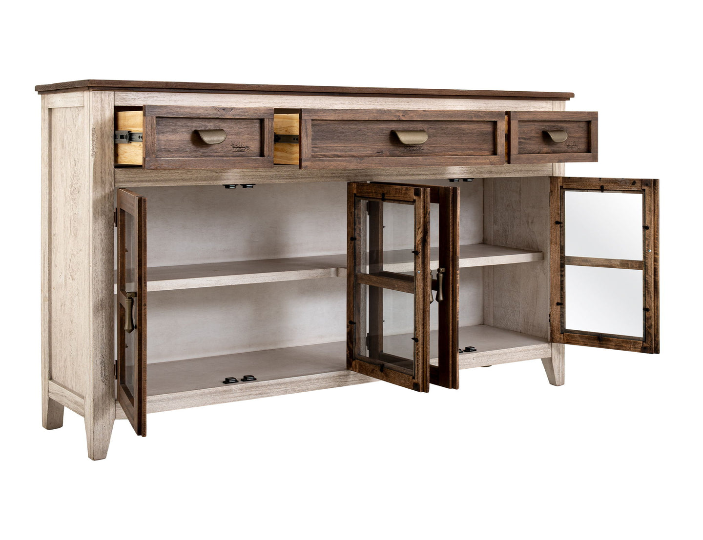 3 Drawer 4 Glass Door Console. Introducing Sahara, an organic modern collection designed to transform your space into a tranquil and neutral haven. Crafted from sustainably sourced, lightly distressed mango wood, this stunning minimalistic collection effortlessly blends style and sustainability, making it a perfect fit for any space.