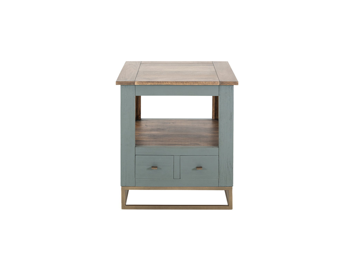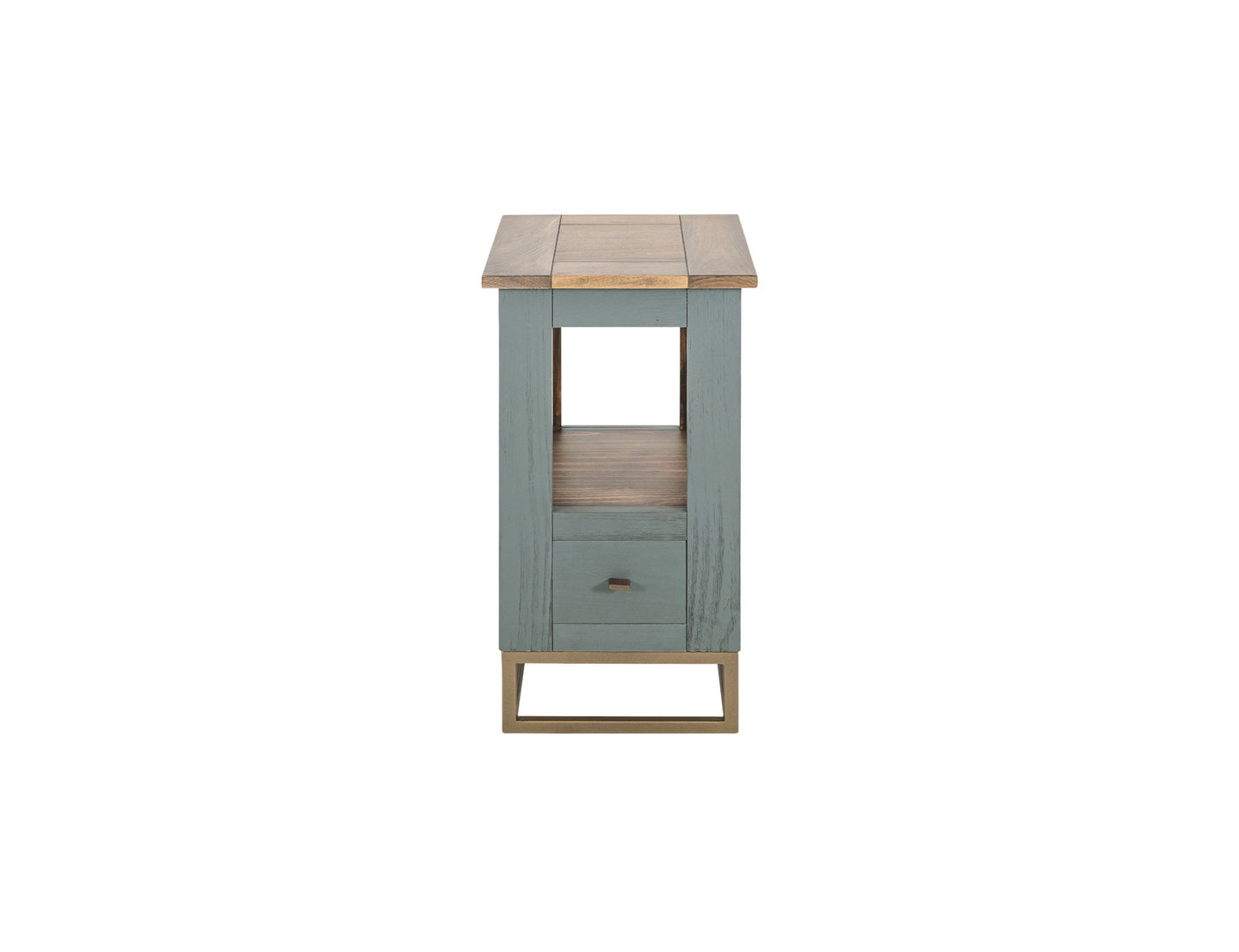The chair-side table's rectangular shape combines versatility and elegance. It features a convenient drawer for discreet storage and an open shelf for displaying decorative items or books. Its sleek gold metal base provides sturdy support and adds a touch of modern sophistication. The Timber Chairside table is designed to complement the other pieces in the collection and enhance the aesthetic of any room.