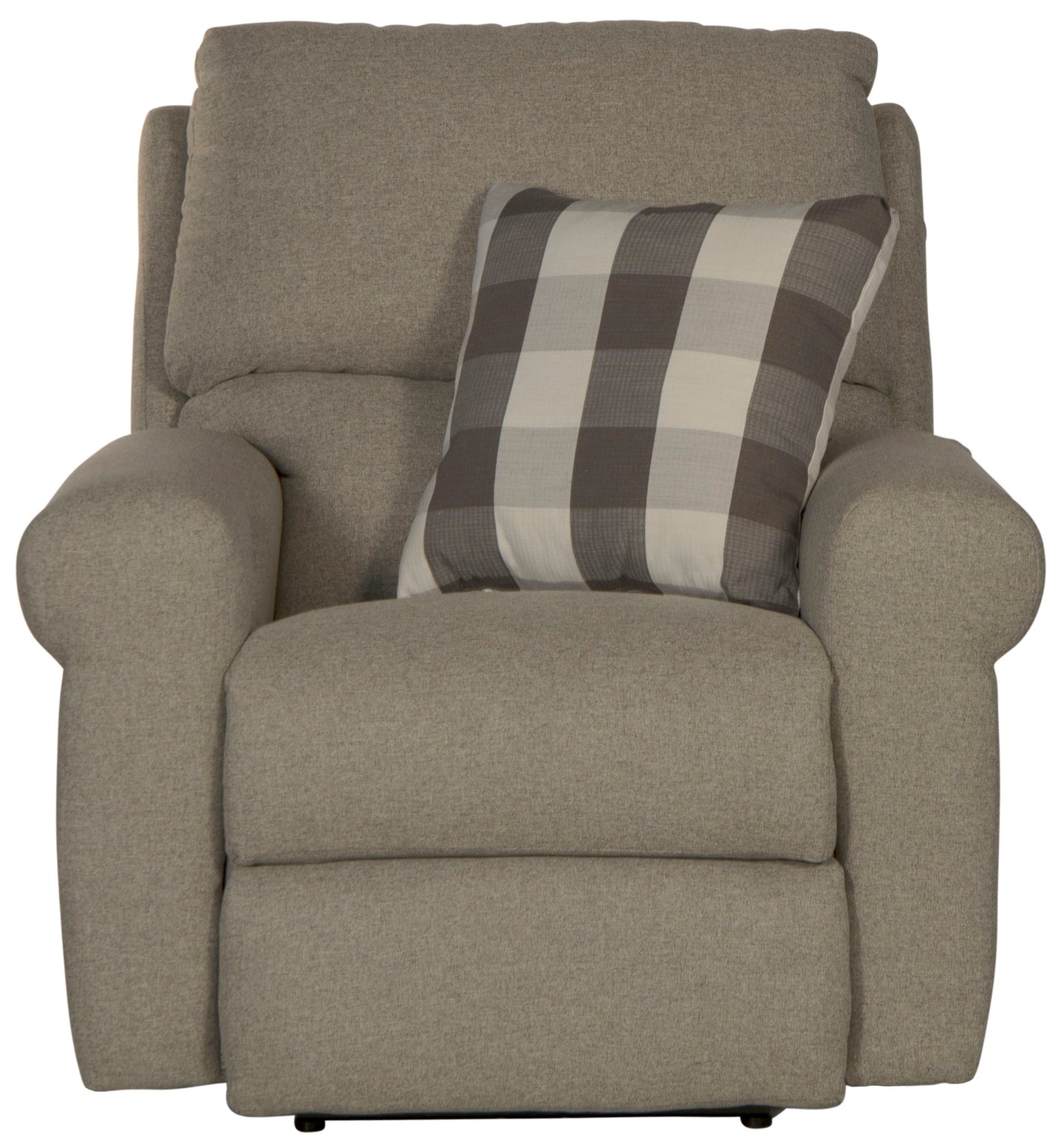 The WESTPORT glider recliner features a Farmhouse Casual style with its Greek Key arm treatment, soft body fabric, and an included accent pillow.